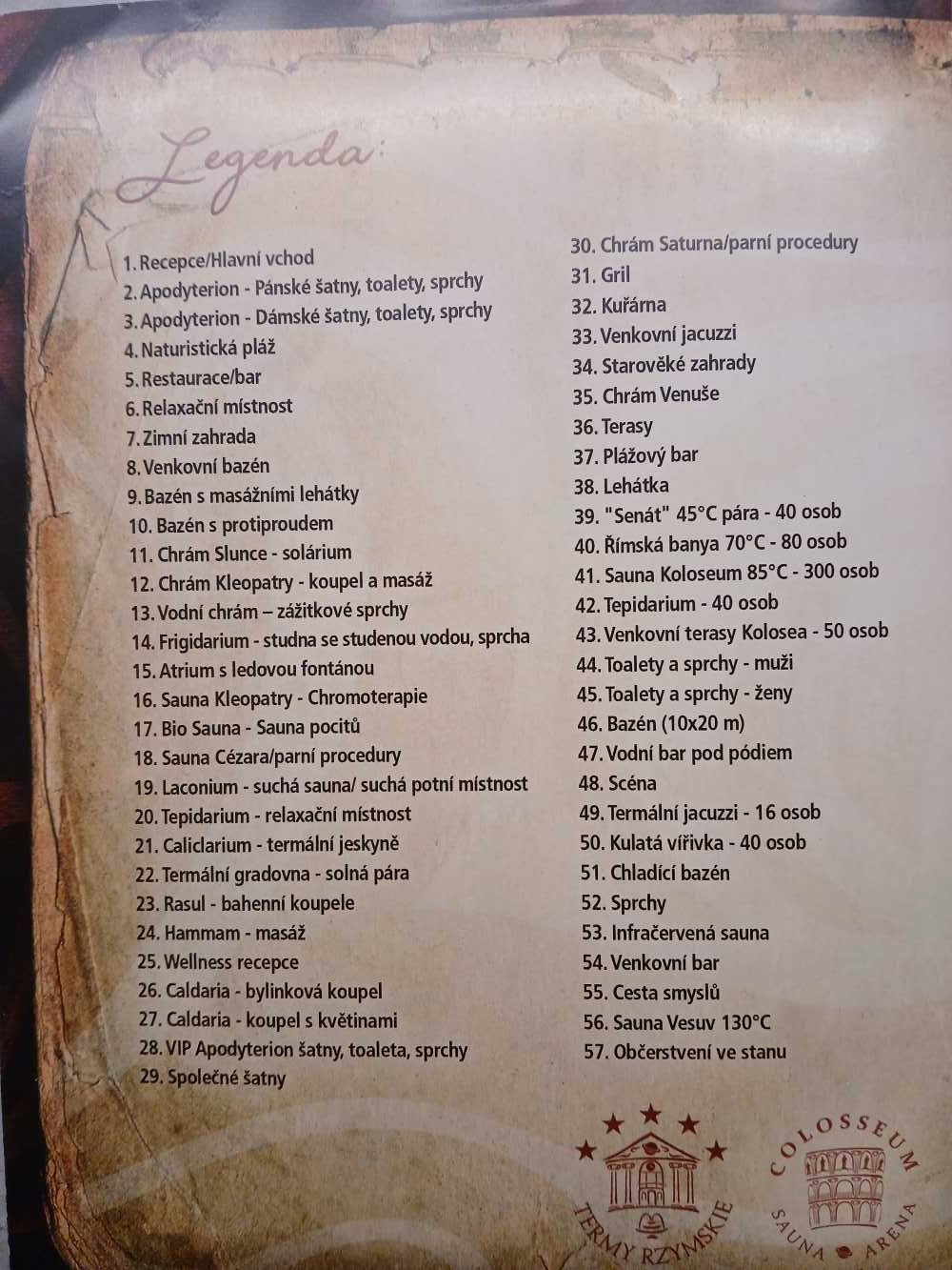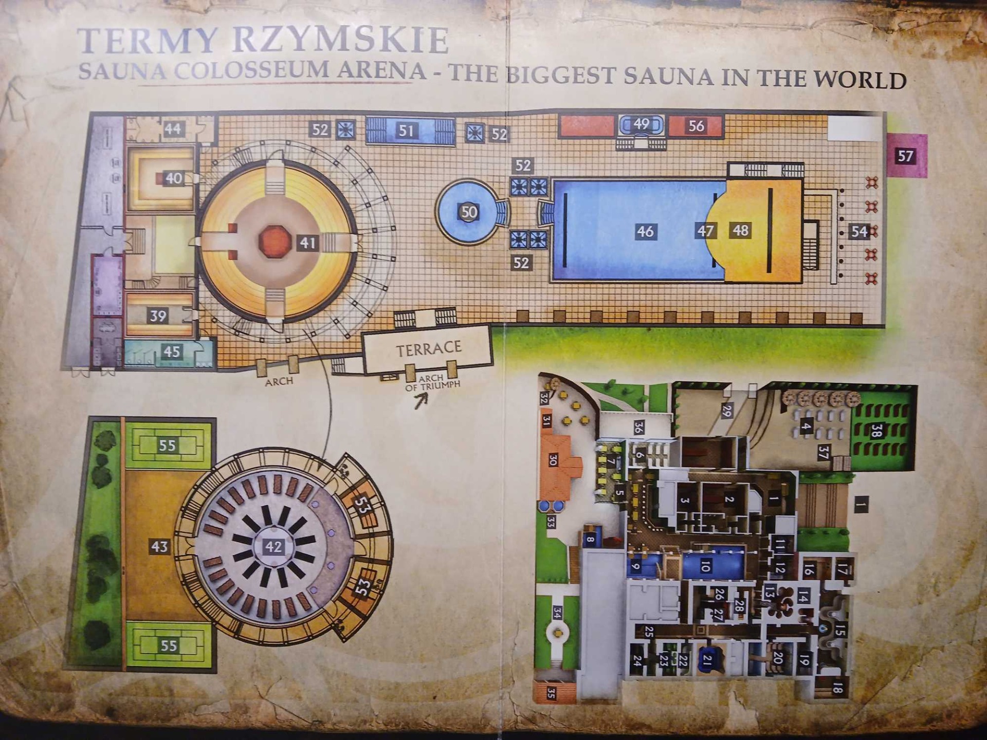 Abych vám ukázal, co vše je v Termach k vidění, přikládám sem níže fotku plánku. Co na fotce neuvidíte jsou třeba ceremoniály. Nám ty dva co jsme viděli přišly na náš vkus příliš hlučné. Zvlášť hlasitost hudby při ceremoniálu "souboj gladiátorů" dávala pocit, že jste spíše v rockovém klubu než v sauně. Ale lidem se to evidentně líbilo. A vzhledem k častým akcím zaměřených na různé saunové show s mnoha zahraničními hosty i soutěže v ceremoniálech snad budou zdejší ceremoniály i dosti populární. Takže berte náš názor jako čistě subjektivní.